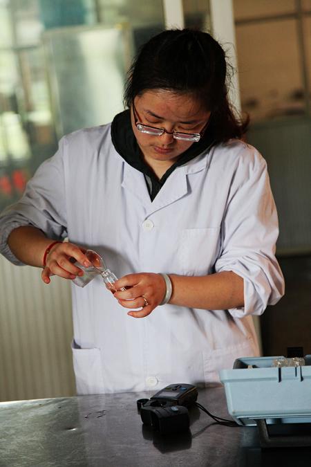 圖為供水公司水質(zhì)化驗員對學(xué)校內(nèi)管網(wǎng)水進(jìn)行現(xiàn)場檢測化驗