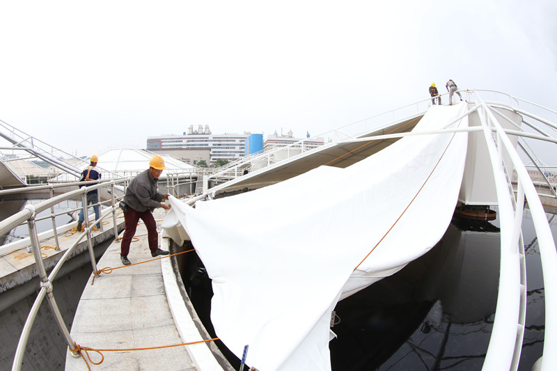 日前,江濱水處理公司20萬噸/日集中預(yù)處理二期工程污泥濃縮池進入鋼結(jié)構(gòu)膜安裝階段,預(yù)計于本月底基本完成。該除臭系統(tǒng)由8個鋼結(jié)構(gòu)反吊膜裝置及2個生物除臭裝置組成,為公司第四批建設(shè)的除臭項目。至此,公司在臭氣治理上已累計投入2000余萬元,目前廠區(qū)內(nèi)高、中濃度臭氣基本實現(xiàn)全收集、全治理,為實現(xiàn)“生態(tài)江濱”目標(biāo)打下了堅實基礎(chǔ)。
