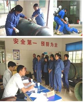 本次演練分空氣呼吸機正確佩戴使用和瓶身、針型閥應(yīng)急堵漏操作兩個項目進行,參演人員在現(xiàn)場模擬出的緊張氛圍中都能井然有序、有條不紊地完成全套動作。通過本次液氯演練,提高了值班員對突發(fā)事故的分析應(yīng)對處理能力,取得了較好的效果。
